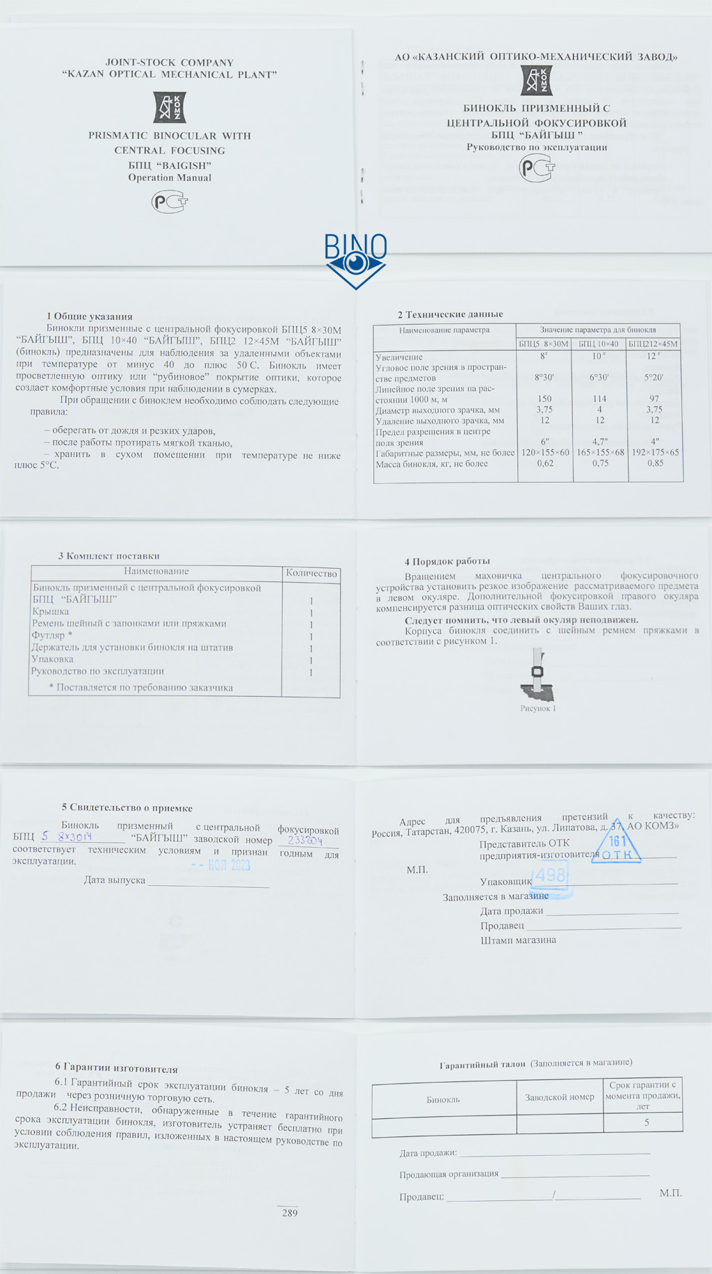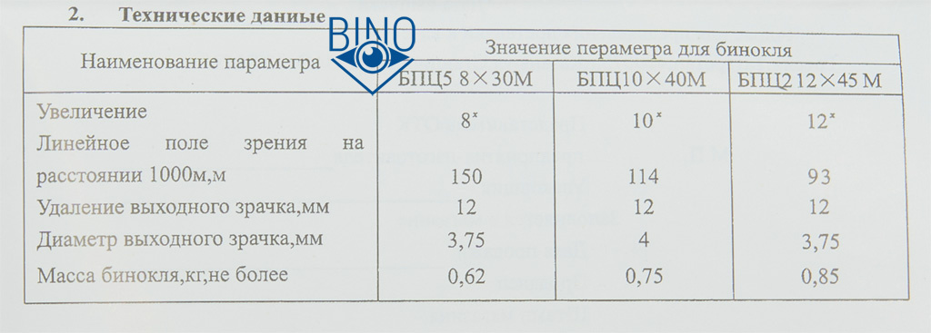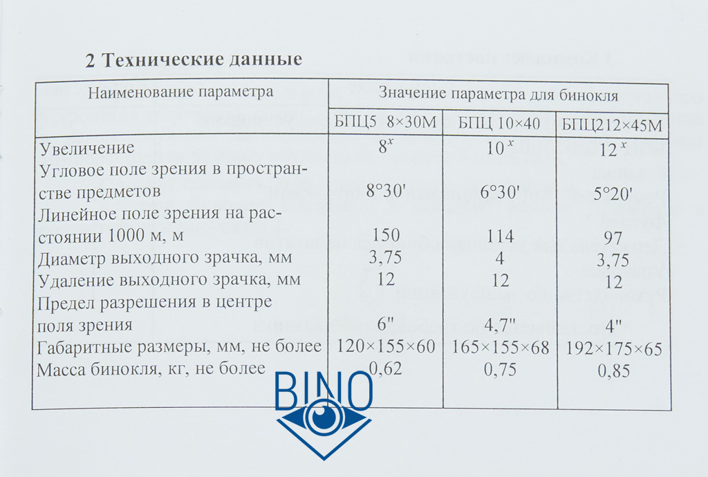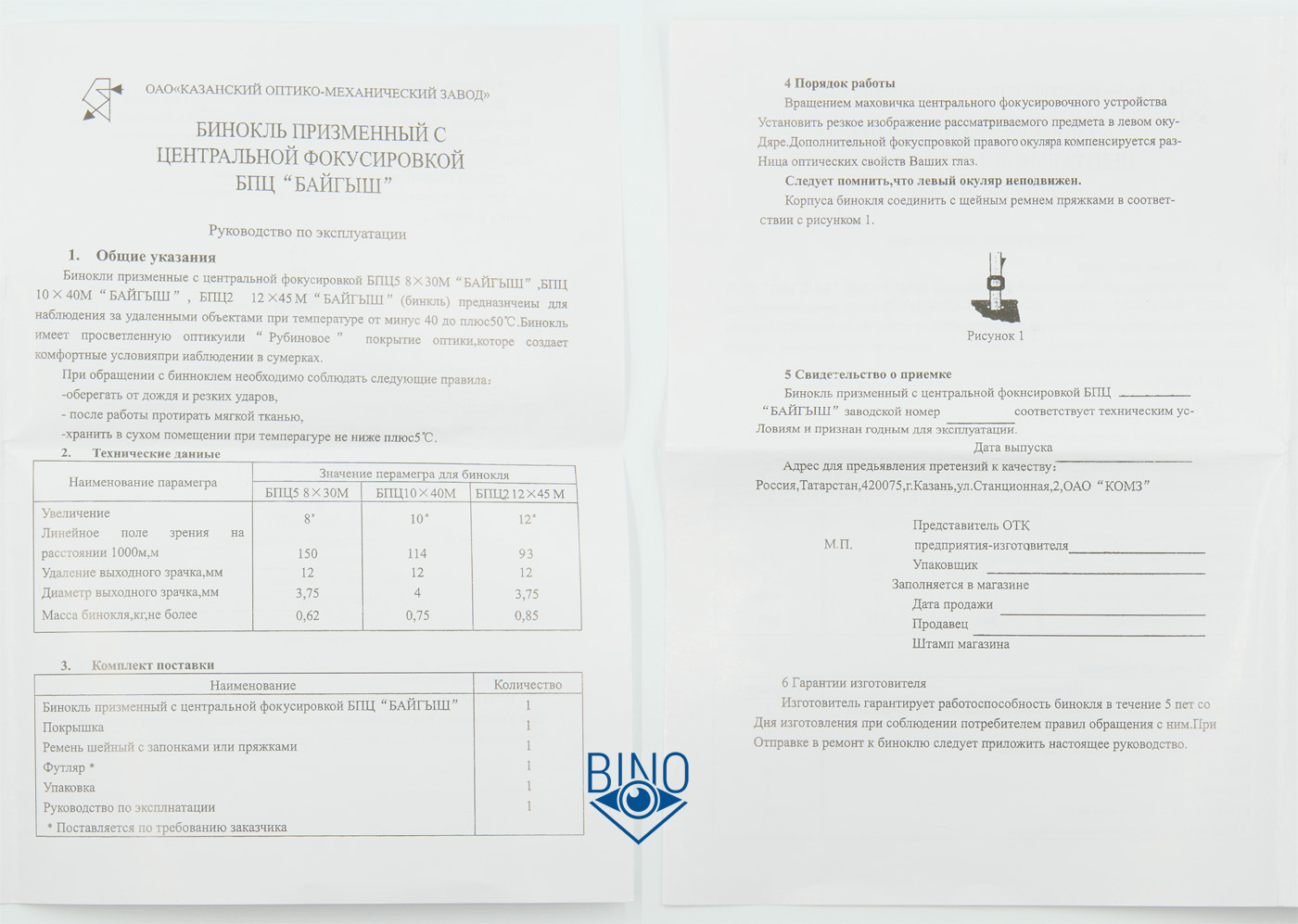 Комплект БПЦ5: бинокль, сдвоенная крышка на окуляры (рейнгард), нашейный ремень, сумка, крепление на штатив.