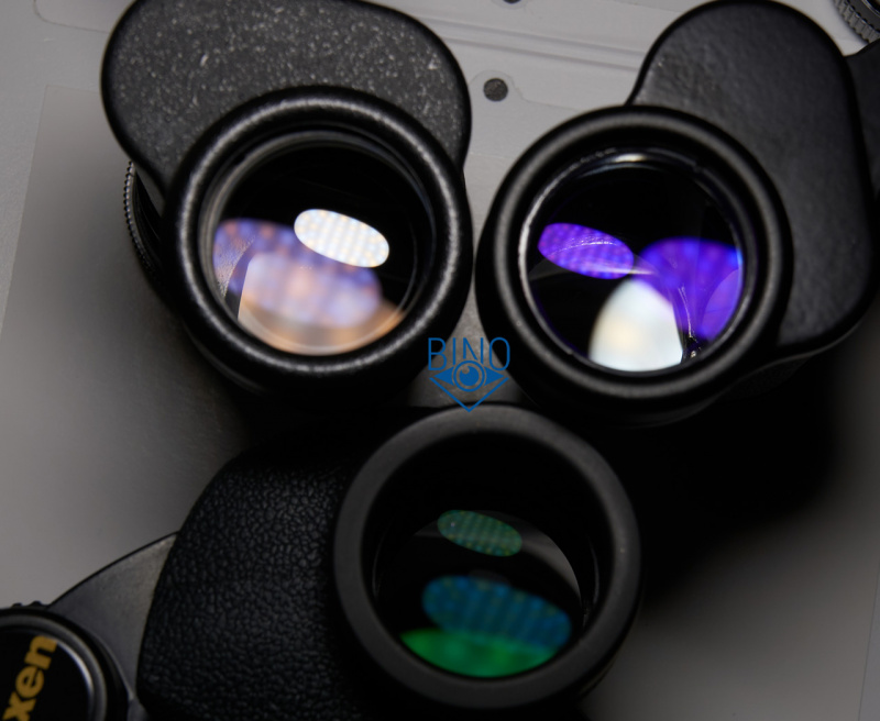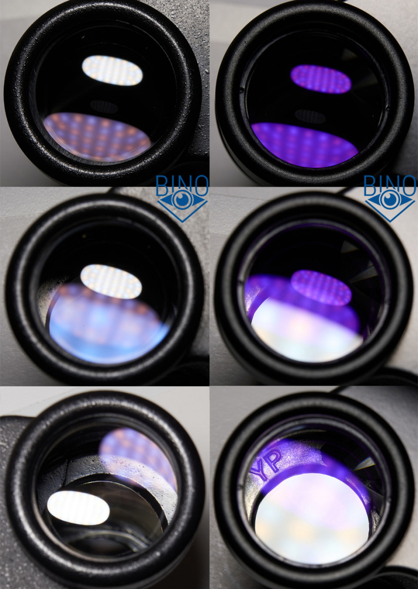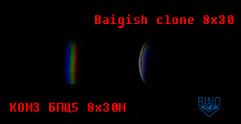 Ниже можно сравнить яркость бликов от просветлений оптики Байгышей со среднебюджетным Порро биноклем середины 2010-х Vixen Foresta 8x32. Слева БПЦ5, справа копия, под ними Foresta, у которой все блики с зелёным окрасом и гораздо менее яркие: