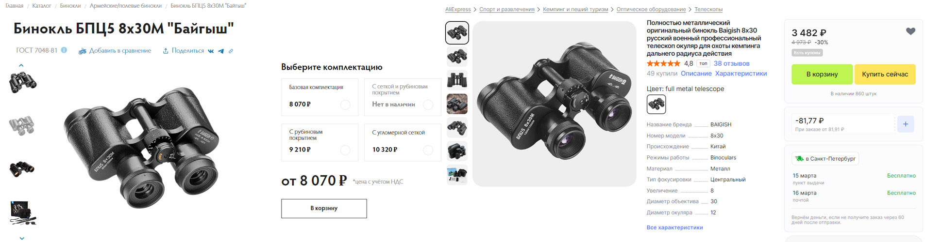 С покупкой оригинала было сложнее: новогодние каникулы и отсутствие модели у производителя. В сторонних магазинах рассказывали про большой заказ для ВПК, и, как следствие, нужного бинокля в наличии не было. Была классическая версия с угломерной сеткой и обрезиненная версия БПЦ6, которая мне понравилась внешне, но сравнивать я собирался с биноклем без обрезинки, поэтому решил подождать окончания каникул.