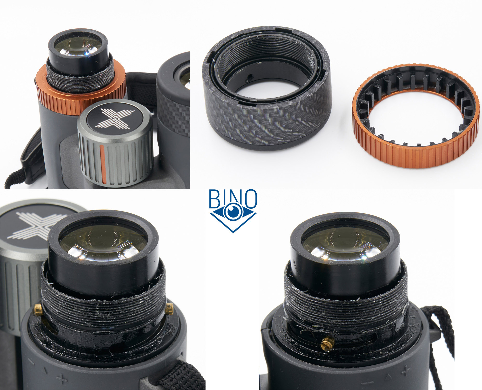 Однако после использования бинокля зимой при температуре -6С я пытался сложить наглазники, чтобы убрать бинокль в сумку, и один наглазник у меня скрутился с окуляра. Благодаря этому удалось посмотреть как реализована диоптрийная коррекция: правый окуляр вращается на геликоиде, оранжевое кольцо зацепляется за два выступа по бокам.