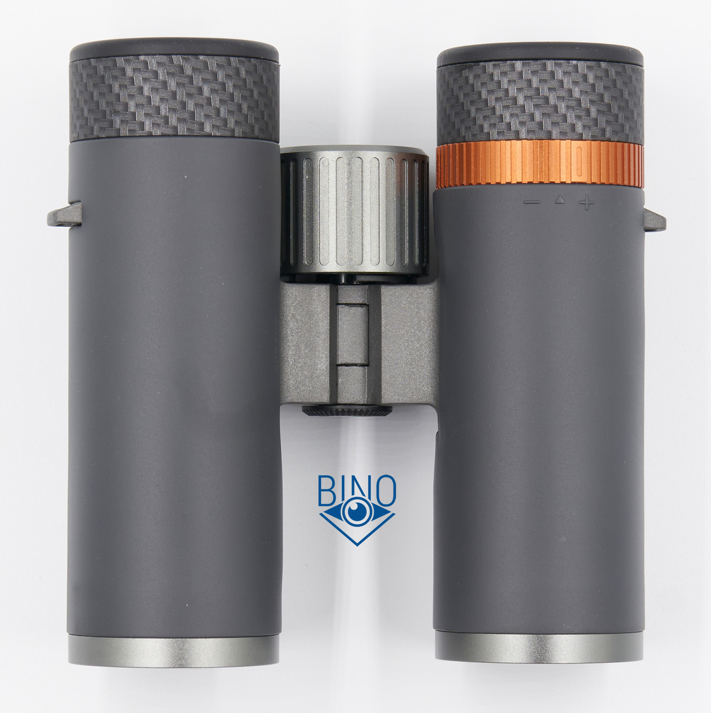 Бинокль увесист (535гр), но очень компактен (длина 126мм), возможно даже слишком компактен. По хвату тубусы только-только получается обхватить тремя нижними пальцами, указательный ложится на мост. Корпус затянут тонкой обрезинкой серого цвета (скорее даже клеёнкой), которая хорошо собирает пыль. Особенно пыль забивается в гравировку сбоку BOSMA. На концах тубусов накручены металлические крышки с обозначением характеристик бинокля, не особо холодные. Мост металлический, на удивление, не холодит руки, на него частично заходит обрезинка.