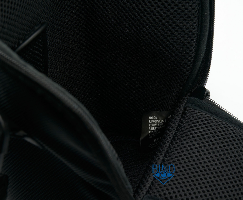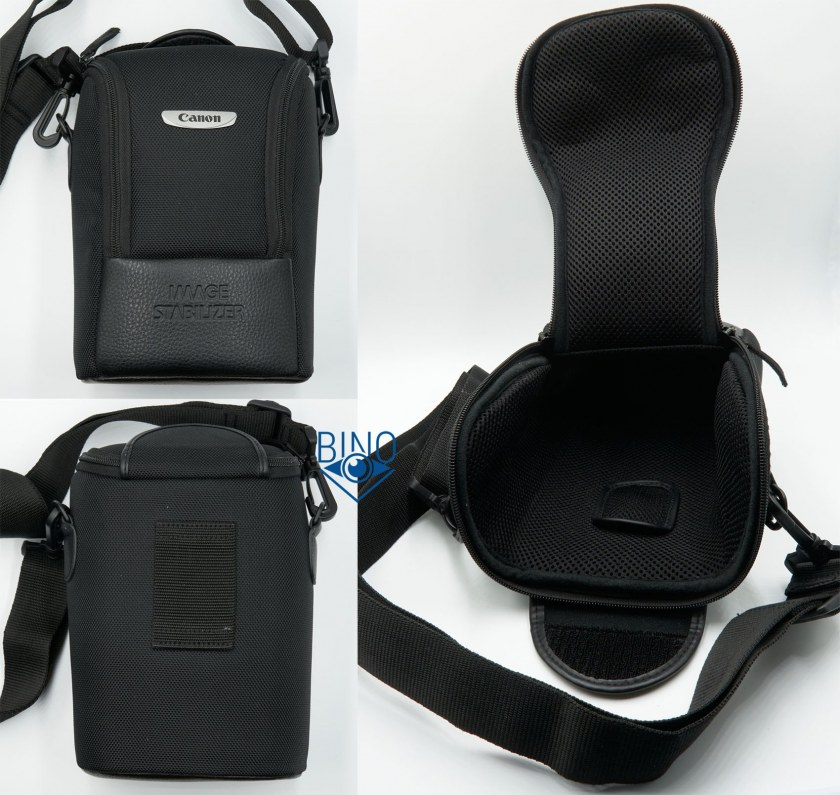 Комплектная сумка хорошего качества, выглядит скорее в стиле сумок для фото-объективов, чем для биноклей. Дно сумки покрыто кожзамом снаружи, уплотнение внутри тонкое, остальные стенки с хорошим уплотнением для защиты от ударов. Молния с двумя застёжками удобна, раскрывается сумка широко. Внутри есть кармашек для запасных батареек. С тыльной стороны сумки есть проушина для крепления на ремень шириной 50мм. Сверху крышка на липучке, можно выпустить нашейный ремешок наружу и нести бинокль на груди в сумке, не застёгивая молнию полностью. Так как полный вес комплекта около 1,5кг, предусмотрен отдельный ремешок для сумки, его можно закинуть на плечо или надеть через голову. Ширина этого ремешка 39мм, он явно не лишний в наборе.