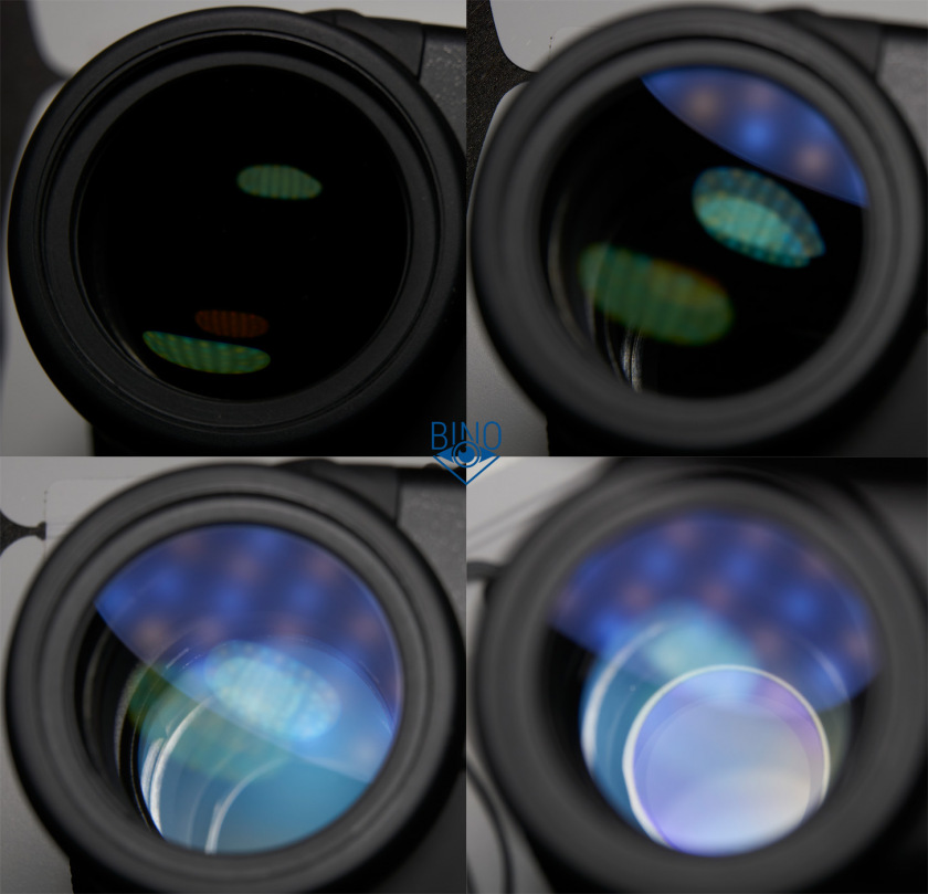Схема объектива похожа на две одиночные линзы (дублет) + фокусирующая линза перед призмами. Блики от просветлений оптики объективов благородных оттенков (зелёные, синие) невысокой яркости. От защитного стекла и призм блики поярче. Применены хорошие покрытия, FMC.