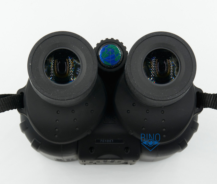 Размеры у бинокля крупные, он пузатый, как и все IS-ы. По габаритам скорее похож на Порро формат 10х50 с раздельной фокусировкой. Центр тяжести неожиданно расположен ближе к окулярам, почти на срезе корпуса. Если бинокль положить горизонтально на стол, то он заваливается на окуляры, не лежит ровно, как на фото в самом начале обзора с официальной страницы Canon. Держать крупный бинокль в руках удобно, картинка стабильнее, чем в более компактный и лёгкий Tract Toric 10x42, на уровне Руфов 10х56.