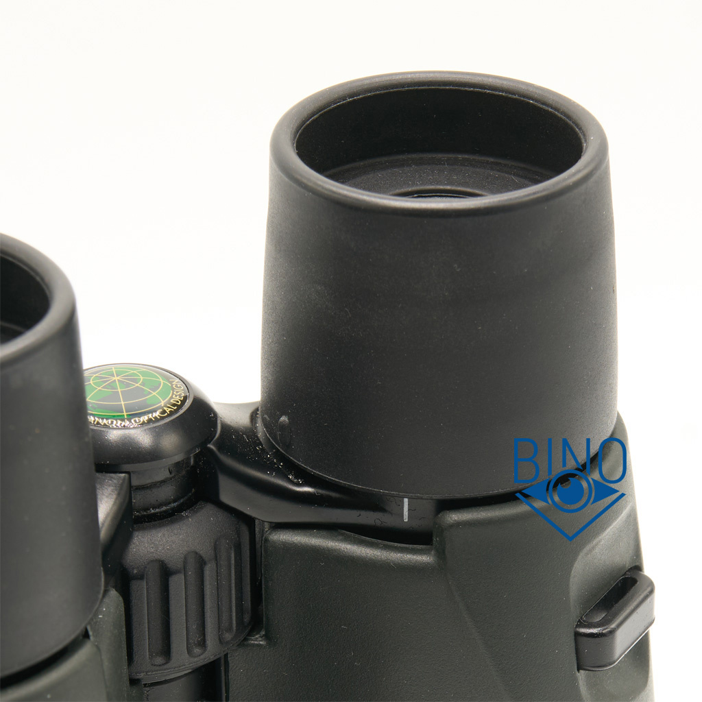 Доступный вынос выходного зрачка: 10 - 0мм (за край сложенных - разложенных наглазников). В очках с тонкой оправой мне видно около половины поля зрения с разложенными наглазниками и всё поле с закатанными; в солнцезащитных очках видно около 80% поля. Вынос зрачка плохо подходит для наблюдений в бинокль в очках.