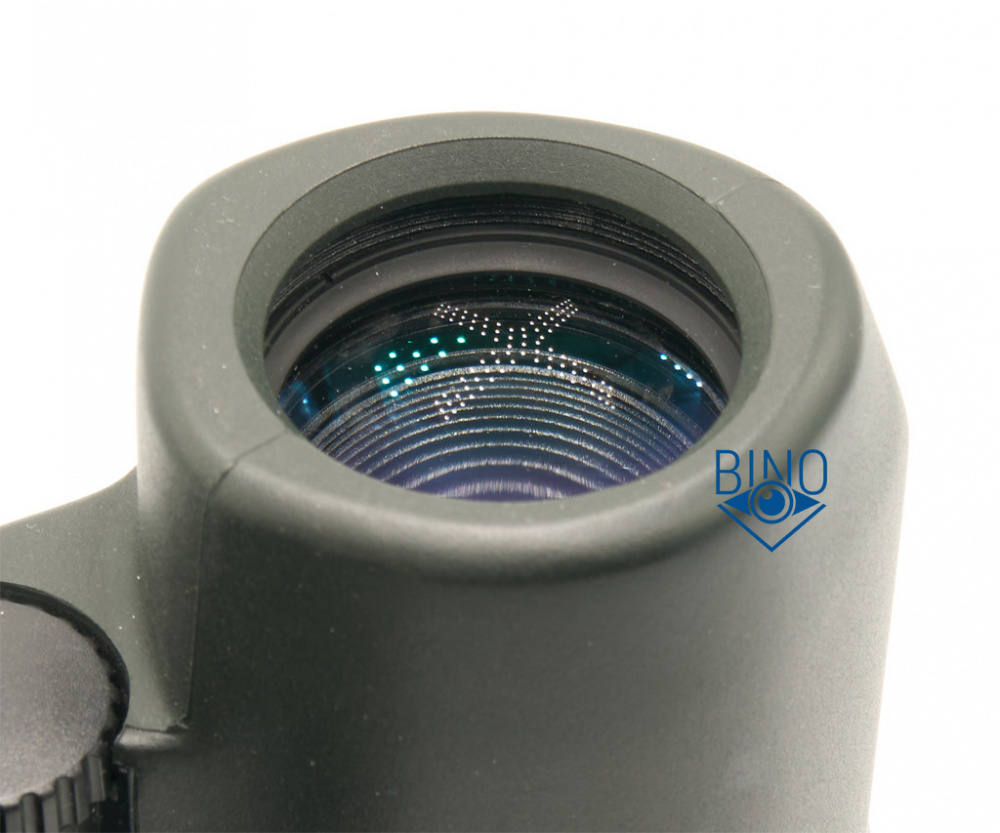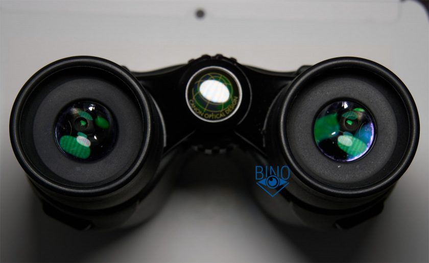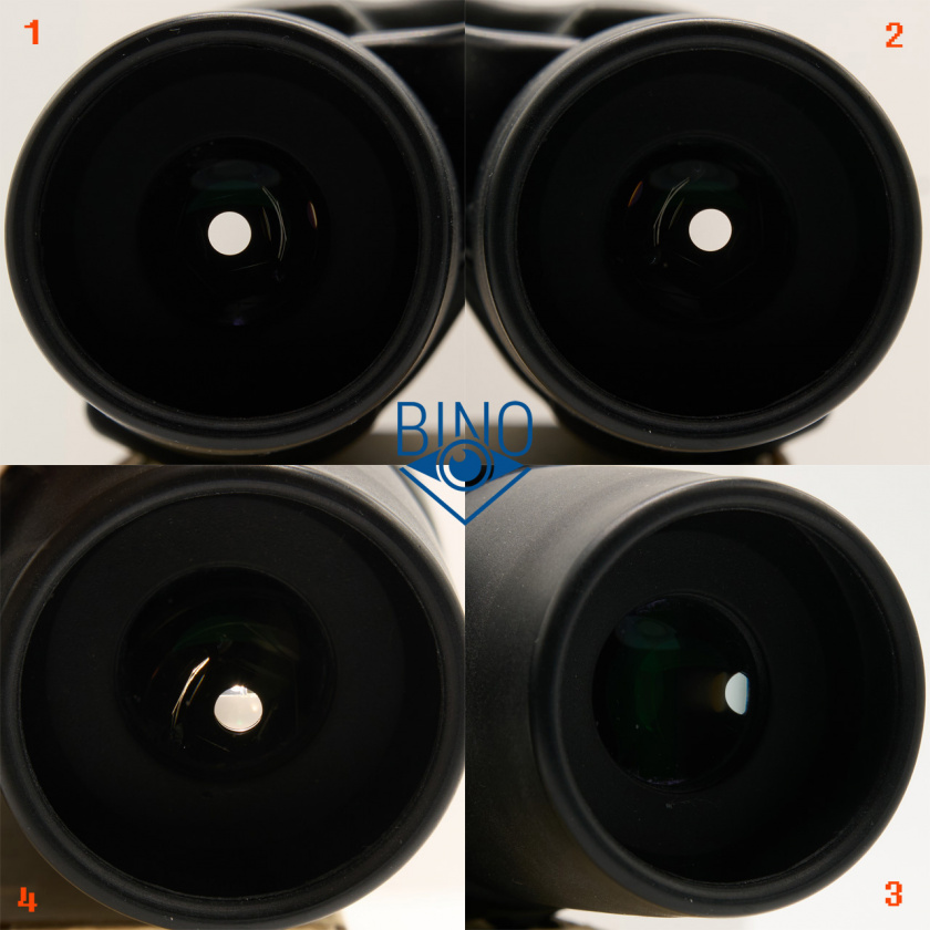 Просвет у объективов около 31,9мм, действующая апертура по тесту фонариком получилась около 29мм. Первая линза объектива утоплена от края тубуса внутрь на 9,4мм по центру и на 11,3мм по краю. Обрезинка загибается вокруг торца тубусов у объективов, формируя неплохой демпфер, постановка бинокля на стол почти мягкая. Перед наружным стопорным кольцом объективов есть нарезка светозащиты, она также присутствует внутри тубусов после них. Внутренности тубусов выглядят аккуратно выполненными и неплохо матированными, внутренняя призменная диафрагма окрашена. Края линз объектива зачернены.
