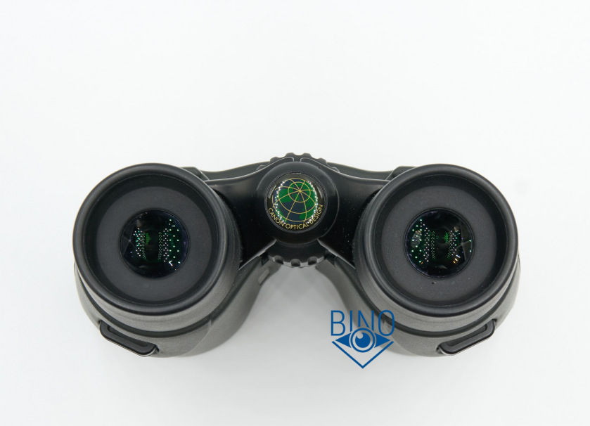 Корпус бинокля затянут твёрдой, почти непродавливаемой, обрезинкой темно-зелёного цвета. Она чуть толще 1мм, если смотреть загиб у объективов. Судя по весу бинокля, корпус должен быть металлический, но мост бинокля, окулярное коромысло, проушины для нашейного ремешка и окуляры больше похожи на пластиковые.