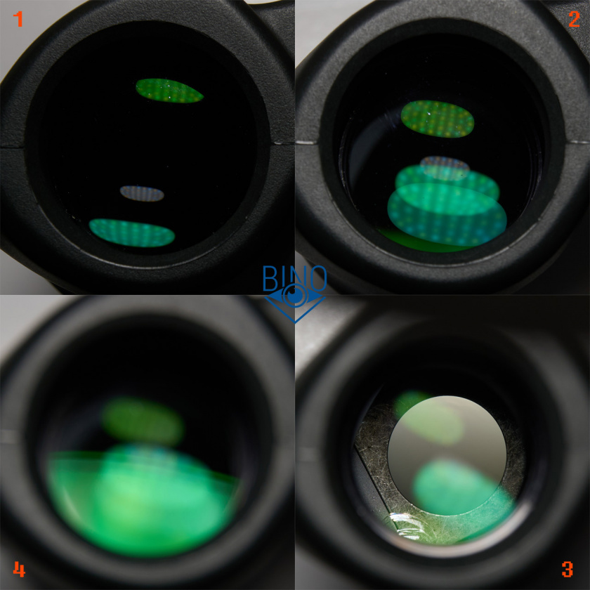 На фото выше (слева): 1 - выходной зрачок левого канала, 2 - вз правого канала, 3 - вз на краю (оценка виньетирования), 4 - имитация наблюдений в сторону Солнца (подсветил объектив сверху фонариком смартфона).
