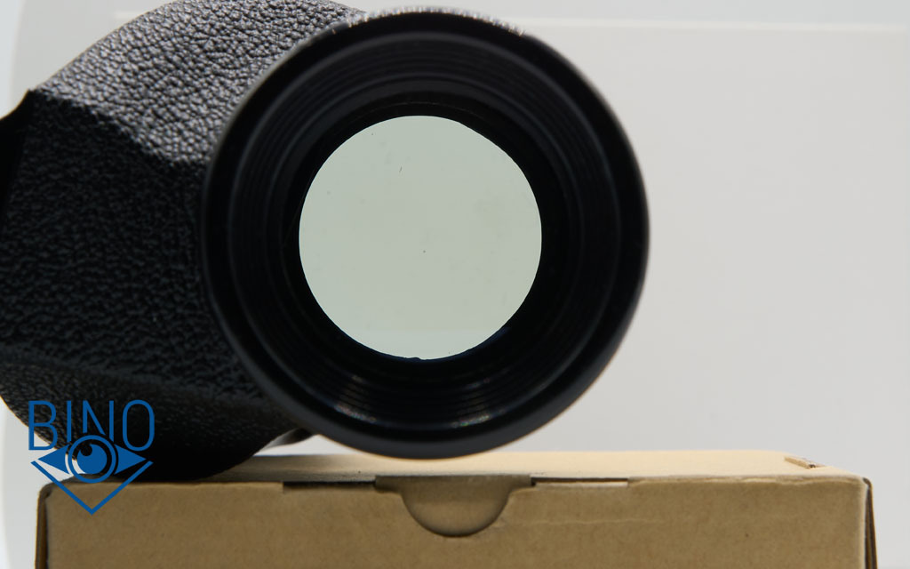 Глазная линза среднего диаметра 23,3мм, плоская. Утоплена от края окуляра (без наглазника) на 7мм по центру и краю. Доступный вынос выходного зрачка (далее ВЗ) от края окуляра (без наглазника) около 5мм. Полный вынос ВЗ от стекла получается около 12мм. Блик от просветлений оптики окуляра снаружи средней яркости, зеленого оттенка - применена многослойка, от внутренних поверхностей блик янтарного оттенка и выше по яркости, это однослойка.