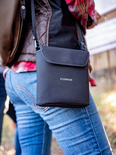 Бинокль помещается внутрь сумки только со сложенными наглазниками, даже собранному ремешку сверху нет места. Его нужно выпустить наружу, так как он один на сумку и бинокль, как на фото с официального сайта.