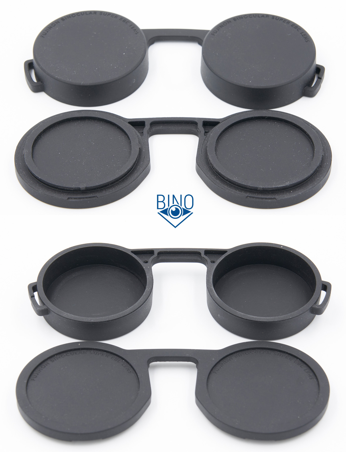 Крышки на объективы внутреннего зацепления, соединены перемычкой друг с другом. Держатся на зацеплении четырёх выступов, достаточно хорошо. Их можно прокручивать внутри тубусов. Изготовлены из резины средней жёсткости, на морозе не должны дубеть. С нижней стороны есть углубление, за которое можно потянуть и быстрее снять крышки.