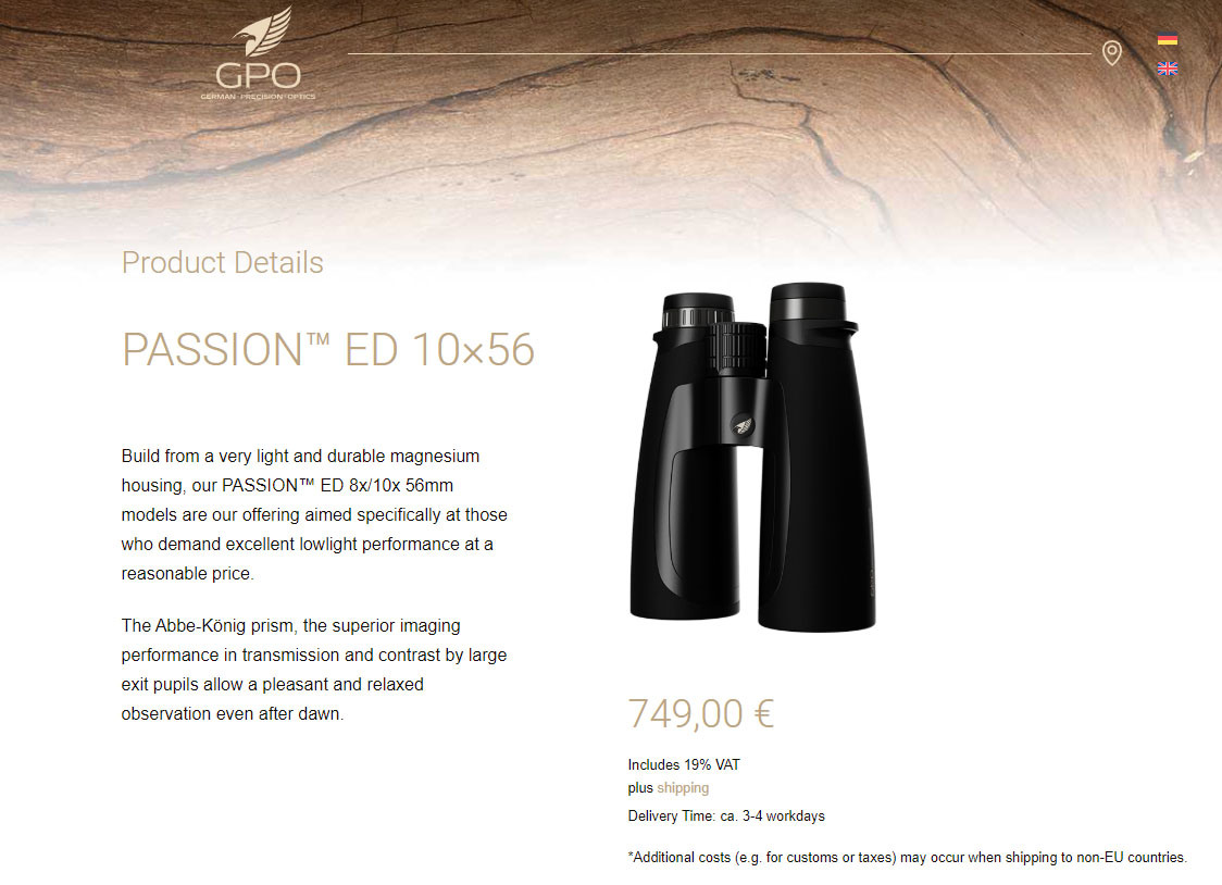 Идея бизнеса была не нова, GPO шло по стопам новичков оптического рынка того времени: Maven, Styrka, Tract. Они решили предложить своим покупателям качественную оптику, сравнимую по уровню с большой тройкой Leica - Swarovski - Zeiss, но по более выгодным ценам, так сказать, нарушить существующую гегемонию, и отъесть у больших ребят часть рынка. На мой взгляд, у них вполне получилось, в конце 201х годов было представлено много хороших биноклей по привлекательным ценам, это было отличное время для покупки оптики. Позже КОВИД-19 внёс свои коррективы, ассортимент биноклей сократился, а цены поползли вверх. Линейка Passion ED тоже подросла в стоимости, стала ближе к Conquest HD, но, всё-таки, осталась заметно дешевле: модель PASSION ED 10х56 сейчас стоит в два раза меньше, чем Zeiss Conquest HDX 10х56. Давайте разбирать, что из себя представляет пред-топовая линейка GPO и насколько она близка или остаёт от Conquest HD.