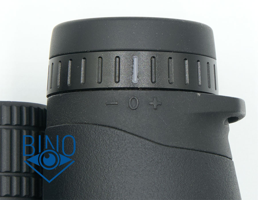 Диоптрийная коррекция выполнена на правом окуляре в виде пластикового кольца с рифлением, на левом окуляре расположено такое же по высоте, гладкое, кольцо под наглазником для симметрии. Вращение кольца диоптрийной коррекции тугое, без ступенек, на 55 градусов влево от нулевой метки и на 55 градусов вправо.
