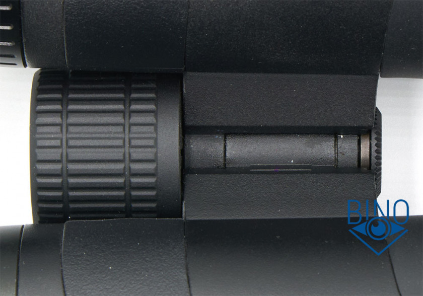 Колесо фокусера похоже пластиковое в обрезинке снаружи, диаметром 35мм и высотой 30мм. Поверхность выполнена с частыми насечками, есть одна длинная во всю высоту колеса. Сцепление с колесом не очень хорошее, палец по нему немного проскальзывает (особенно в перчатках), хорошо, что высоты колеса достаточно для вращения двумя пальцами. При случайном задевании колесо немного сдвигается, примерно на 5°, это люфт в его работе. Такая проблема встречается на биноклях GPO из первых партий, позже производитель исправил механику. Ход фокусера средней тяжести и немного вязкий, в фокус я попадаю с первого раза. Расфокусировки между каналами, когда при вращении колеса фокусера одна из фокусировочных линз чуть запаздывает, нет.
