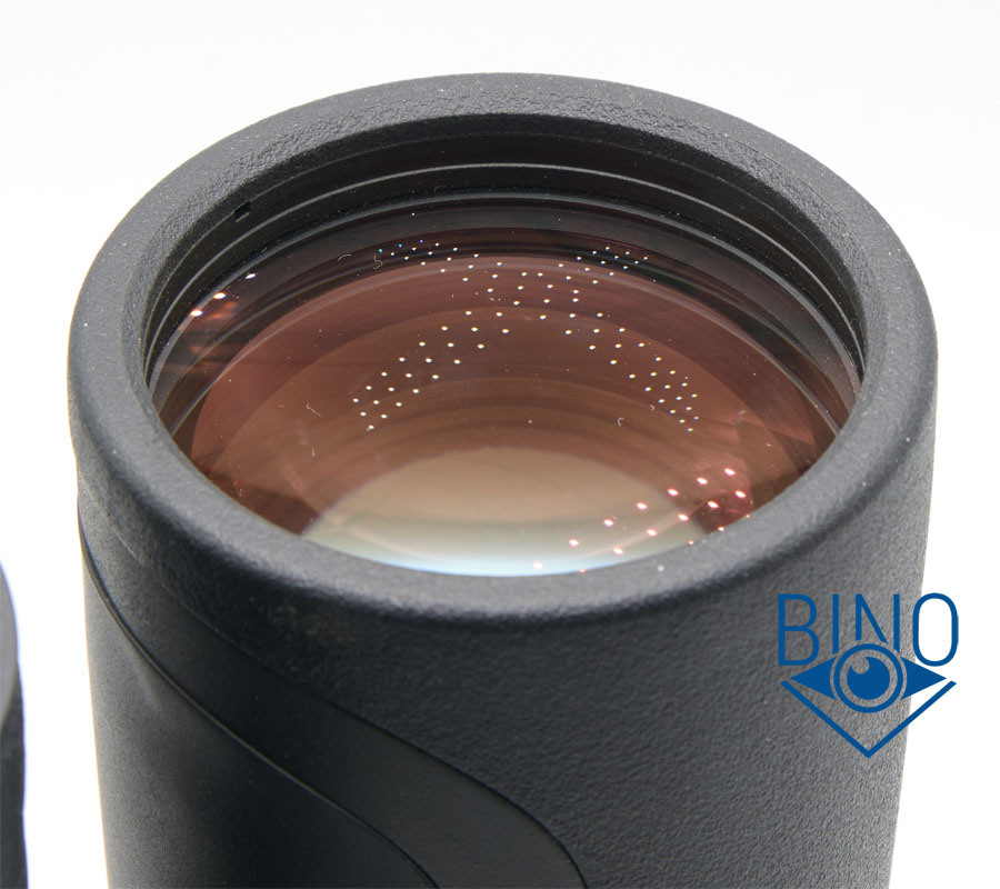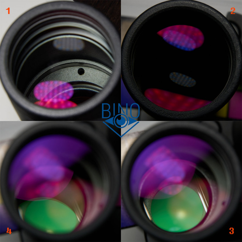 Схема объектива: одиночная линза плюс склейка-дублет. Блики от просветлений оптики объектива чуть ниже средней яркости, красно-фиолетовых оттенков. Такие же по яркости и цвету блики от фокусирующей линзы, от призмы блики зелёных цветов - применено полное мульти (FMC). Блики от оптики ярче, чем у SRBC 10x50 и поярче, чем у Zeiss Conquest HD.