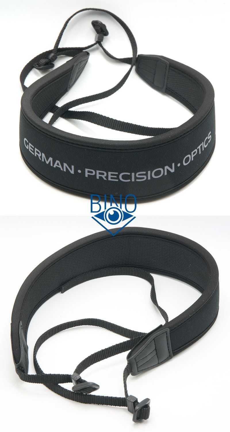 Нашейный ремешок неопреновый, “мясистый” и приятный по качеству, шириной 55мм в самой широкой части и толщиной почти 8мм. Он покрыт тканью только с наружной стороны, хорошо тянется и скорее всего подходит для разгрузки шеи от веса этого бинокля (1250гр). Я не пробовал, формат 10х56 не для ношения на ремешке, на мой взгляд. Проушины для ремешка по бокам тубусов бинокля металлические (скорее всего из магниевого сплава), сильно выступают наружу и широкие, тесёмки ремешка легко в них продеваются.