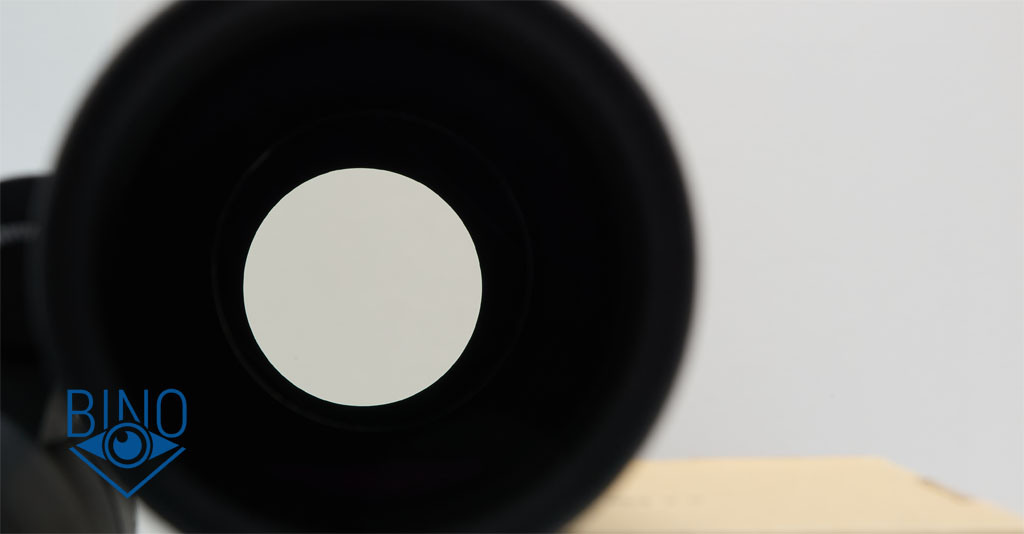 Выходной зрачок диаметром около 5,6мм, почти круглый по форме. Фото левого канала получилось не совсем на оси окуляра. Затенение вокруг ВЗ хорошее, без бликования на внутренностях тубусов или переотражений. По краям есть два ложных выходных зрачка, это особенность призм Аббе-Кёниг, они никак не отражаются на наблюдениях (не мешают) при совмещении глаза с выходным зрачком бинокля. Кратность бинокля по отношению апертуры к диаметру выходного зрачка получилась 54/5,6 = 9,65х.