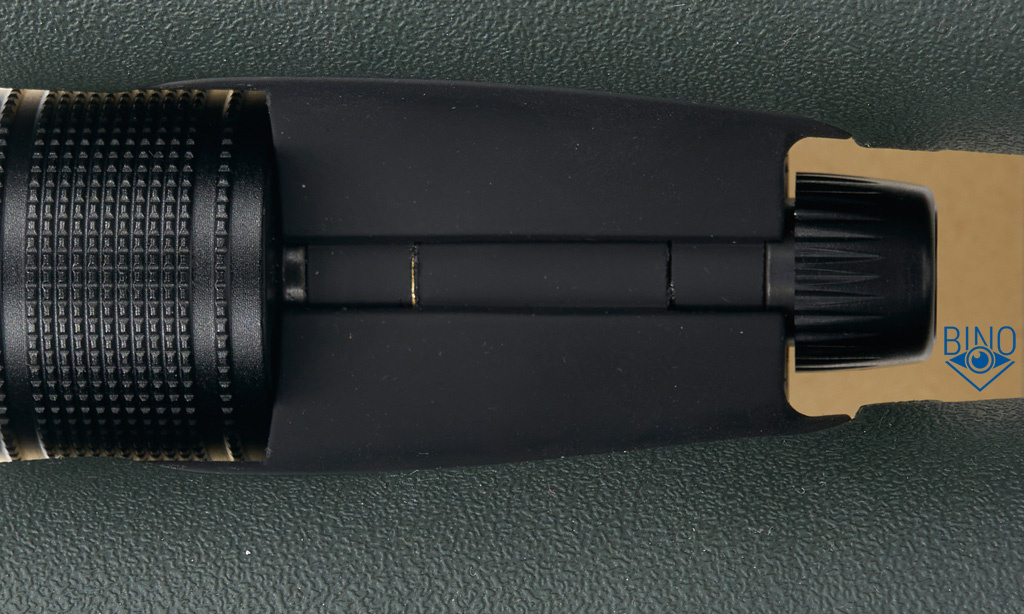 Зеленая обрезинка достаточно приятной фактуры, не скользкая. Твёрдая, почти не продавливается, но не дубовая. Стыки и швы более-менее аккуратные (кроме швов по бокам от колеса фокусера), сборка нормальная. Обрезинка заходит за края тубусов, заворачивается внутрь и закрывает торец объективов. Постановка на стол мягкая.