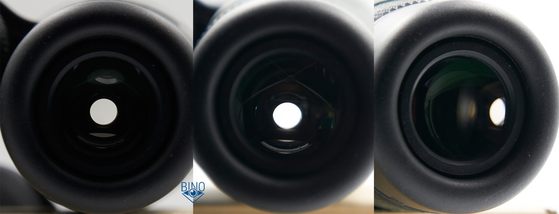 Просвет объективов около 49мм, действующая апертура 48мм. Наружная линза выпуклая, от неё до края тубусов 8,1мм по краю и 7,4мм по центру. Перед ней есть нарезка светозащиты на стопорном кольце. Внутри тубусов также есть подобие нарезки светозащиты.