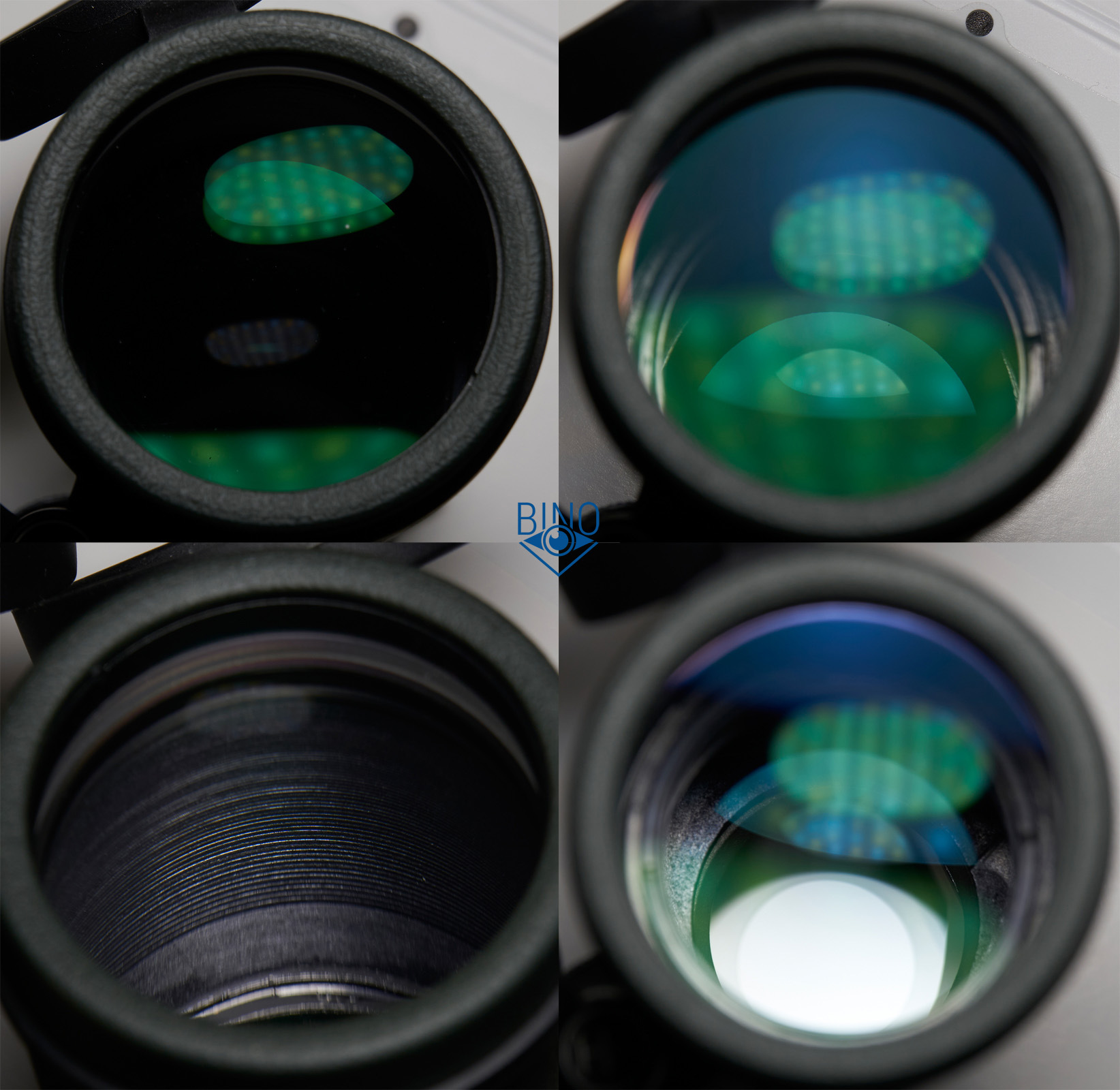 Схема объектива склейка-дублет плюс одиночная линза, дальше идёт фокусирующая линза. Блики от просветлений оптики зеленых оттенков средней яркости. Призмы похоже без просветлений, ярко бликуют без окрашивания блика цветом. Как-то это не характерно для $200 бинокля. Хотя по отзывам у Endurance ED 8x32 призмы были тоже без просветлений. Получается это уже не списать на брак конкретного экземпляра, больше похоже на экономию производителя.