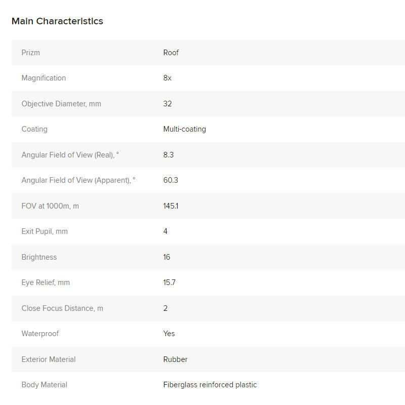 Бинокль поставляется в коробке габаритами ДхШхВ 183х166х74мм и полным весом 0,68кг. Она изготовлена из ламинированного картона, внутри одно отделение.