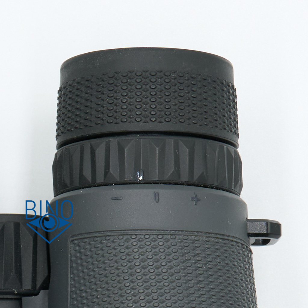 Диоптрийная коррекция выполнена под правым окуляром в виде прорезиненного кольца, которое стилизовано под колесо фокусера. На левом тубусе такого же кольца для симметрии нет. Кольцо не сбивается со своего положения при случайном задевании. Вращение плавное без ступенек и тугое, на 65 градусов влево от нулевой метки и на 65 градусов вправо.