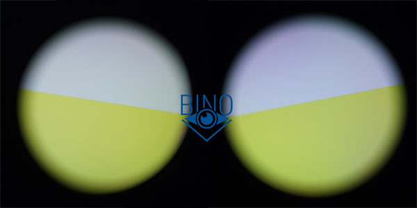 Тест с поляризационным фильтром на просвет через объективы на монитор показал слабый перепад в яркости между половинками апертуры в левом канале, который слабо фиксируется, и более заметный в правом канале. Результат аналогичен SRBC 10x50. На фото ниже демонстрация перепада слева через правый канал, справа через левый:
