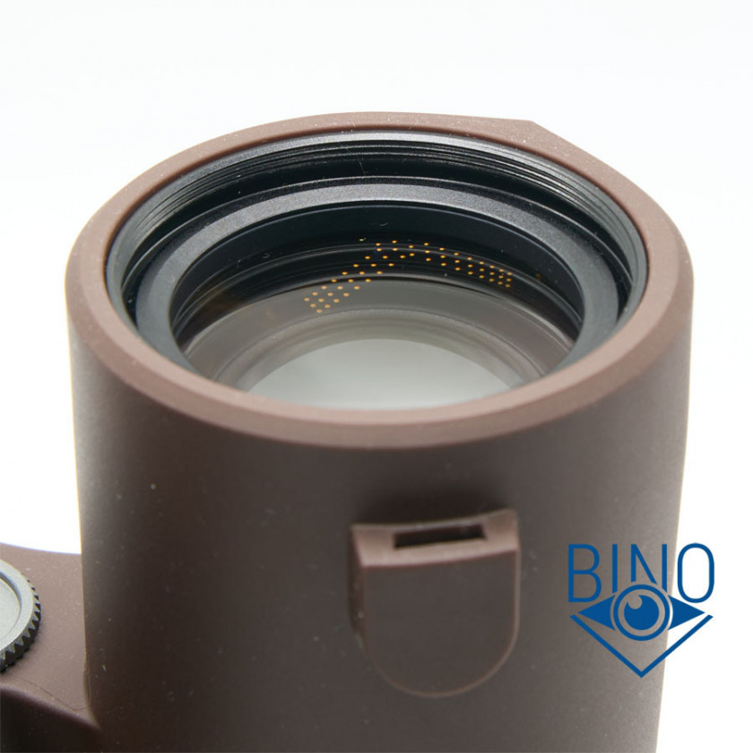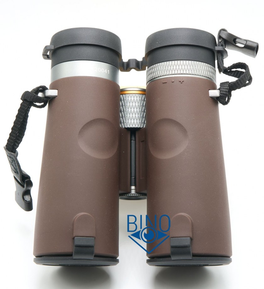 Корпус бинокля затянут обрезинкой коричневого цвета, она немного похожа на клеёнку по ощущениям, хорошо собирает пыль, но и легко моется. Аналогична обрезинке биноклей SRBC, дубовая и почти не продавливается пальцем. Тактильно довольно простая, исполнение скорее на уровне биноклей $250-300 категории. Хотя внешне бинокль смотрится хорошо, возможно обрезинку копировали c Conquest HD, есть схожие ощущения от этих биноклей в руках.