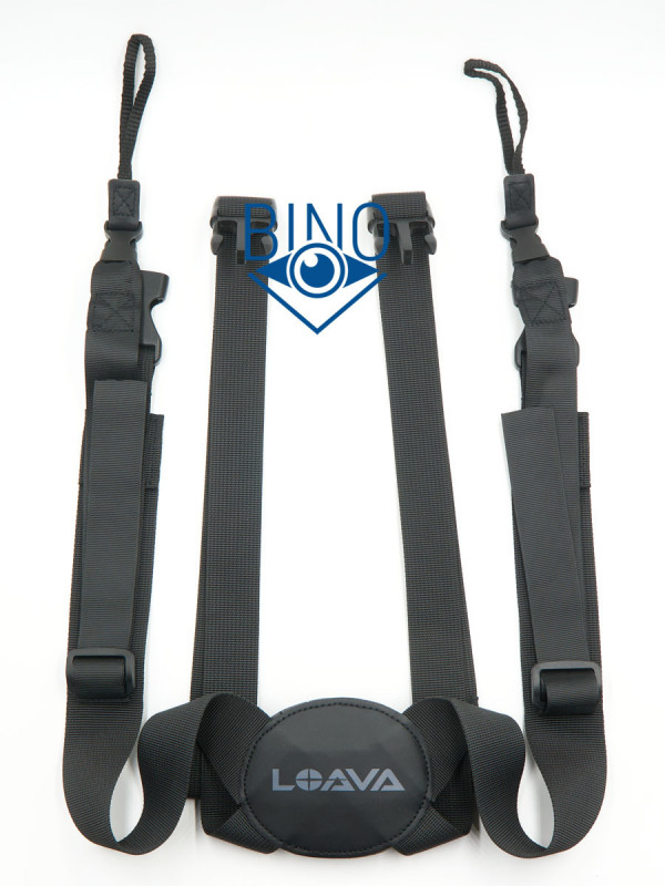 В проушину рейнгарда (и бинокля) еле-еле продевается тесемка от харнесса - это оказался вполне удобный аксессуар. Видимо, производитель оценил большой вес бинокля и добавил харнесс в комплект вместо ремешка для сумки. На этой разгрузке бинокль в сумке ощущается меньше, чем на нашейном ремешке, и не болтается из стороны в сторону во время ходьбы. Правда при ношении сумки на груди становится неудобно ходить в туалет - “краник” не видно.