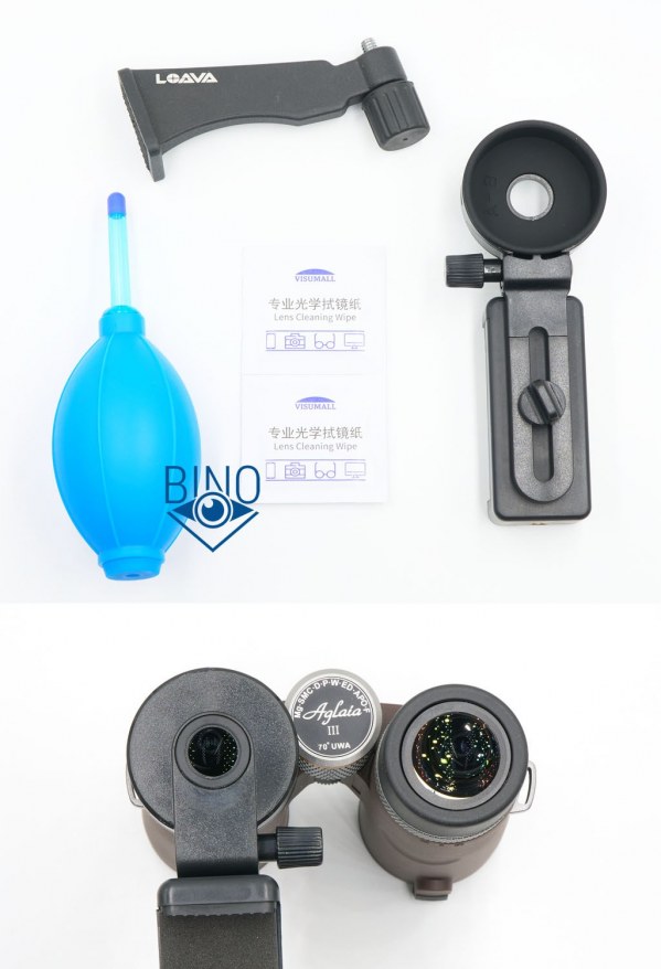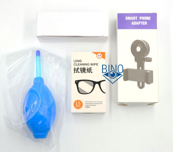 Также есть много допов в виде: груши для сдувания пыли с оптики, набора спиртовых салфеток, адаптера для штативного крепления бинокля и держателя для смартфона для съёмки в окулярной проекции.