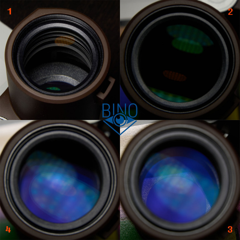 На фото выше (слева): 1 - вид внутренностей тубуса; 2 - блики от объектива; 3 - блики от призмы и вид призменной диафрагмы; 4 - блики от фокусирующей линзы и призмы.