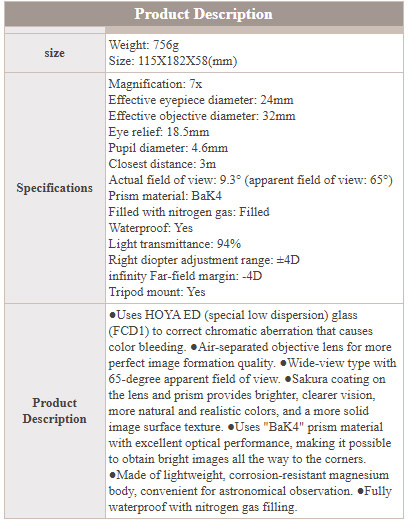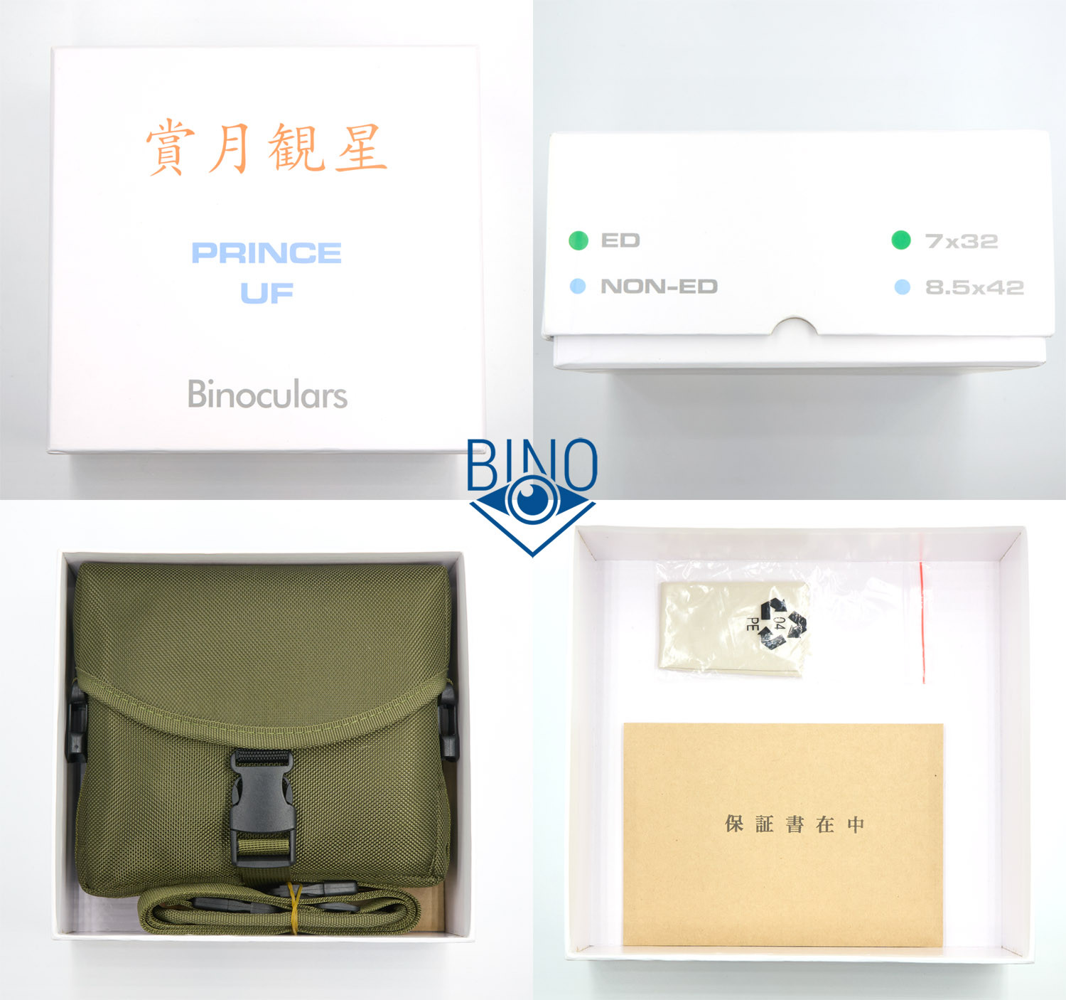 Бинокль поставляется в коробке габаритами ДхШхВ 205х216х87мм и полным весом 1,45кг. Коробка белого цвета с одним отделением внутри. Снаружи на верхней крышке указан производитель Shogetsu Kansei (иероглифами) и название линейки PRINCE UF, сбоку зелёными наклейками отмечена модель ED 7x32.