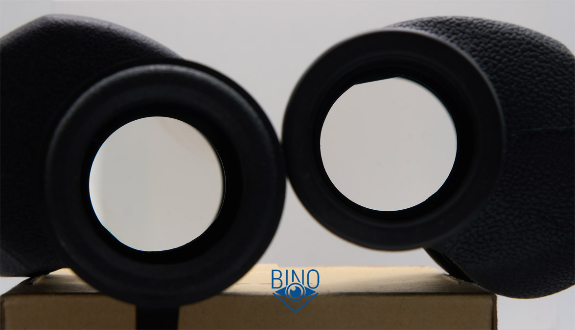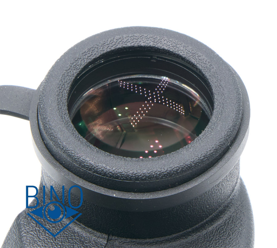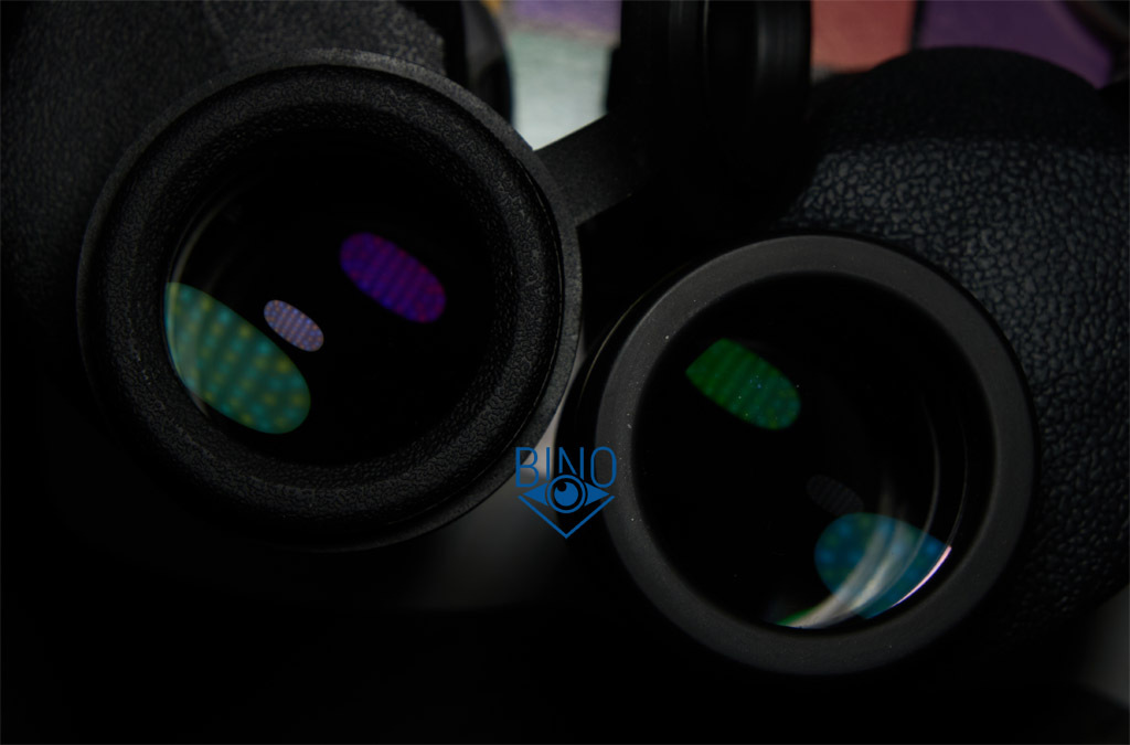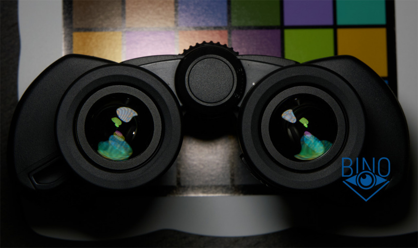 Просвет у стопорных колец объектива около 31,5мм, действующая апертура по тесту фонариком получилась около 31мм. Наружная линза объектива выпуклая, утоплена от края тубуса внутрь на 8,3мм по центру и на 9,8мм по краю. Обрезинка загибается вокруг торца тубусов, формируя неплохой бампер - постановка бинокля на стол более-менее мягкая. Снаружи объектива на стопорном кольце есть нарезка светозащиты, дальше внутри тубусов она отсутствует, как и светоотсекающая диафрагма. Призменная диафрагма, похоже, не окрашена, как и тубусы внутри. Вообще, внутренности бинокля выглядят не особо аккуратно, торцы линз объектива не зачернены, но расположены шире оптического тракта.