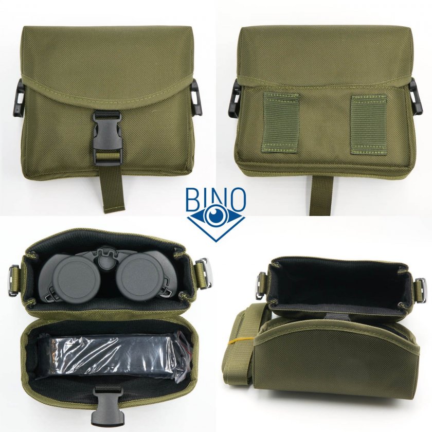 Комплектная сумка синтетическая, стенки со средним уплотнением для защиты от ударов, внутри подкладка под бархат, крышка закрывается на защёлку. Бинокль помещается внутрь по ширине на МЗР=66мм или меньше, выкрученные наглазники не мешают закрыться крышке, там даже есть место для ремешка сверху. Габариты сумки ДхШхВ 170х190х80мм, с тыльной стороны есть две лямки для крепления на ремень шириной 43мм, по бокам защёлки для отдельного ремешка.