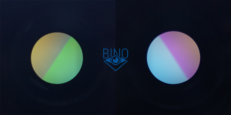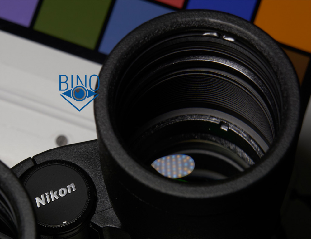 Просвет у объективов около 41,9мм, действующая апертура по тесту фонариком получилась около 40,9мм. Наружная линза объектива выпуклая, утоплена от края тубуса внутрь на 8мм по центру и на 9,5мм по краю. Обрезинка загибается вокруг торца тубусов у объективов, формируя неплохой демпфер, постановка бинокля на стол мягкая. Нарезка светозащиты есть на стопорном кольце объективов снаружи и внутри после объектива, где она слегка бликует. Светоотсекающие диафрагмы внутри тубусов не наблюдаются. Внутренности тубусов выглядят аккуратно выполненными и хорошо матированными, призменная диафрагма окрашена. Края линз объектива нечернены, но расположены шире оптического тракта.