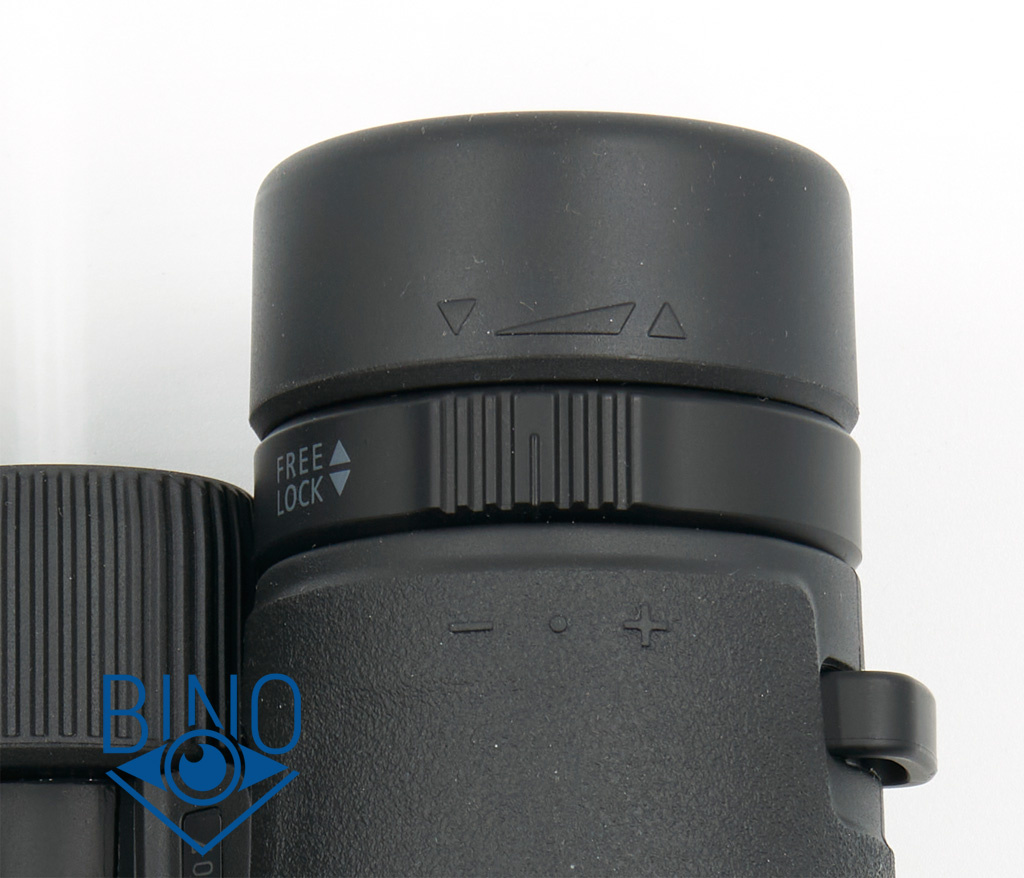 Диоптрийная коррекция выполнена под правым окуляром в виде пластикового кольца, на левом окуляре такое же кольцо под наглазником для симметрии. Вращение кольца диоптрийной коррекции тугое, без ступенек, на 70 градусов влево от нулевой метки и на 80 градусов вправо. При вращении правый окуляр выдвигается наружу или задвигается внутрь.