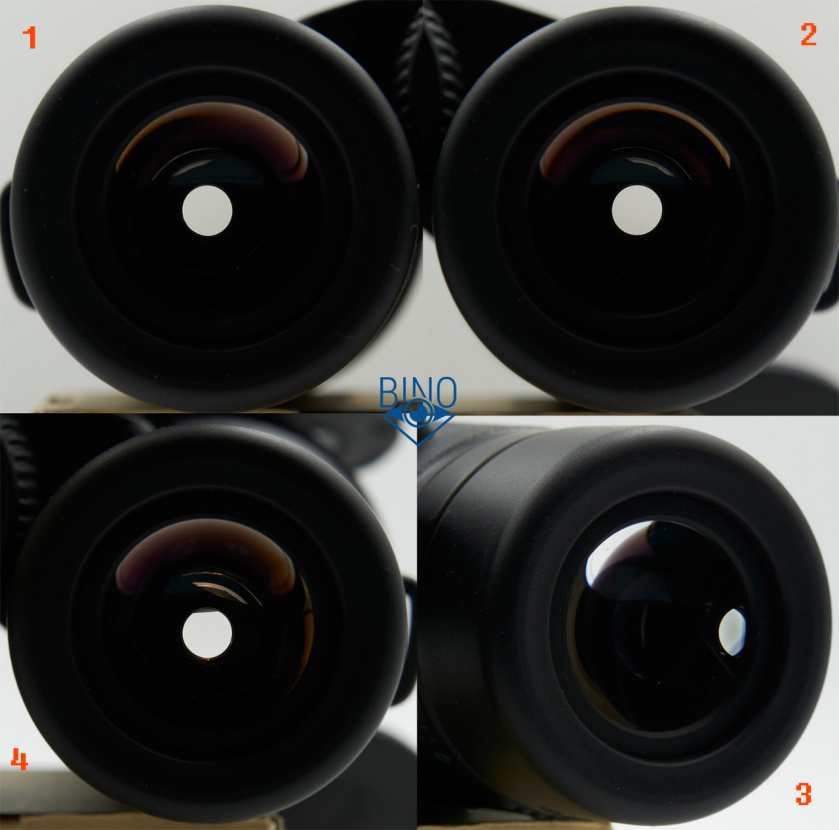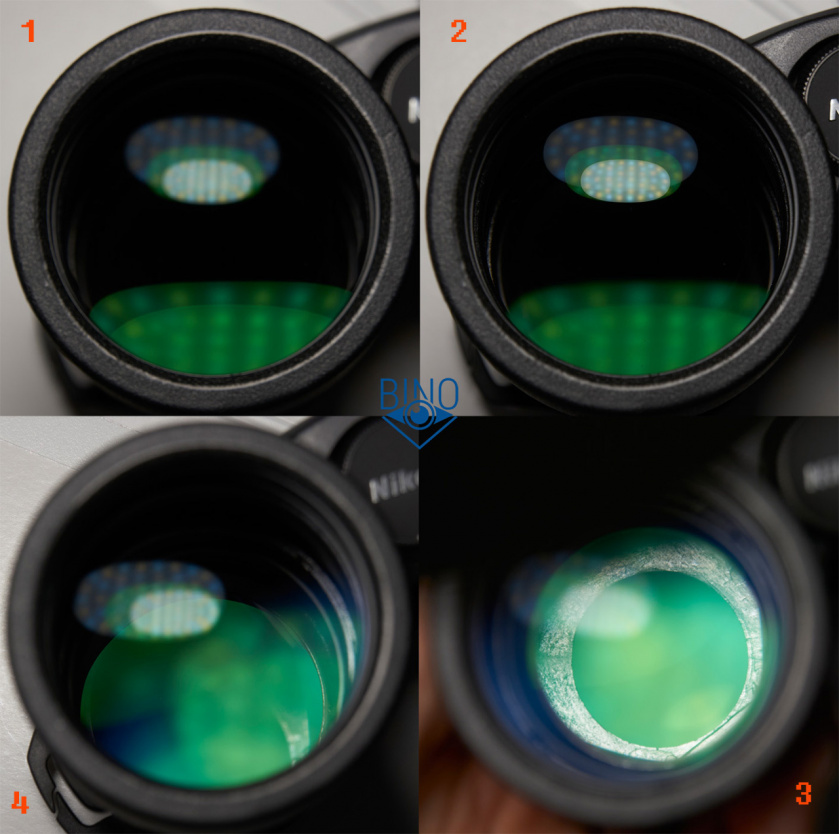 На фото выше (слева): 1 - выходной зрачок левого канала, 2 - вз правого канала, 3 - вз на краю (оценка виньетирования), 4 - имитация наблюдений в сторону Солнца (подсветил объектив сверху фонариком смартфона).