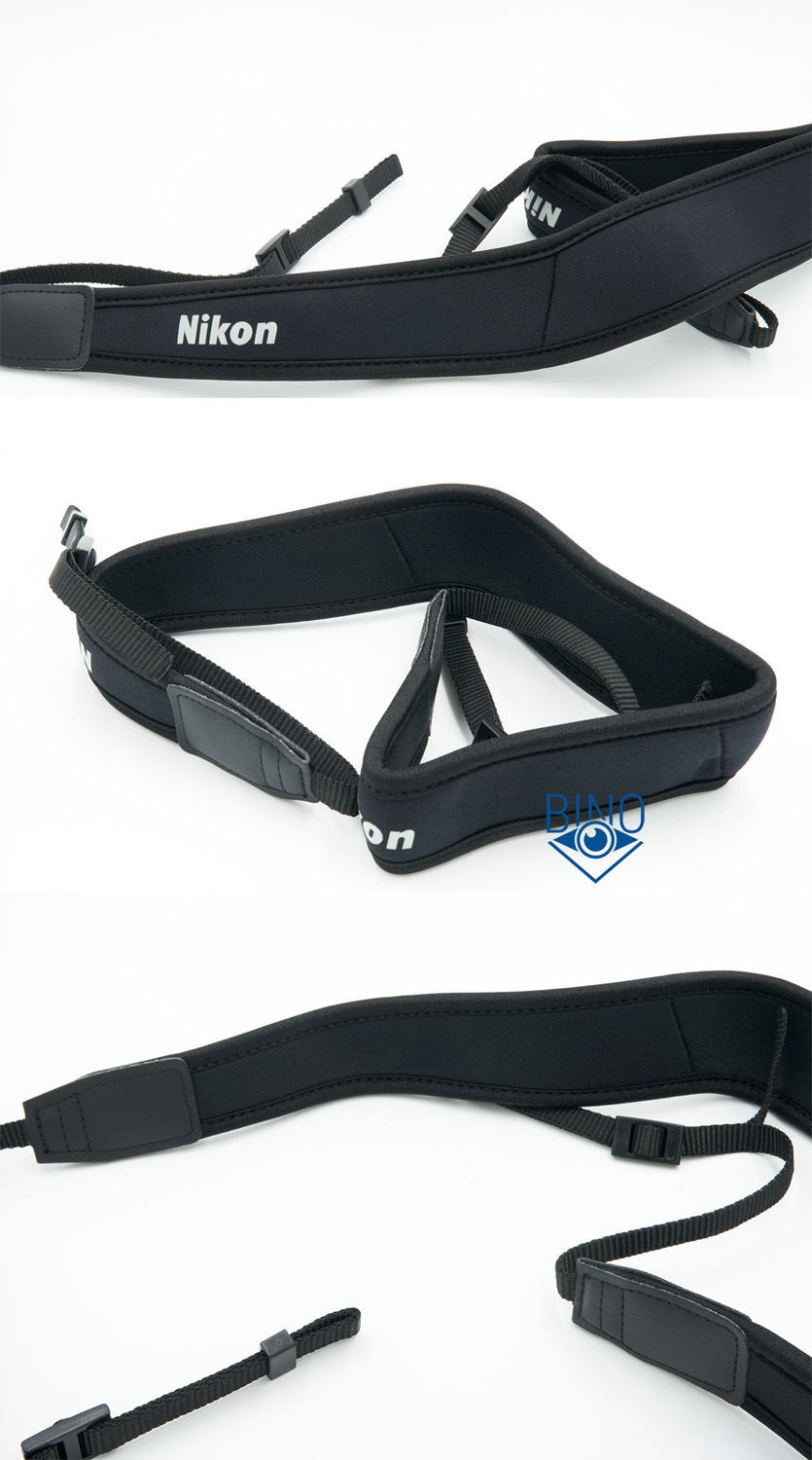 Нашейный ремешок неопреновый, шириной 46мм и толщиной 5мм, покрыт тканью с обеих сторон. Он хорошо тянется и подходит для разгрузки шеи от веса этого бинокля, который составляет всего 660гр. Длина ремешка без учёта тесёмок - 62 см, для меня он довольно длинный, в связи с этим бинокль располагается у меня в районе живота, а не выше на груди, как я привык.