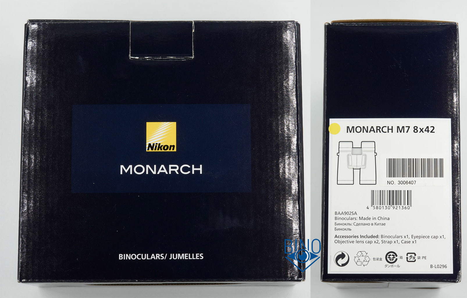 Бинокль поставляется в коробке габаритами 180х193х100мм (ДхШхВ), общим весом 1,3кг. Внутри одно отделение, куда только-только помещается весь комплект.