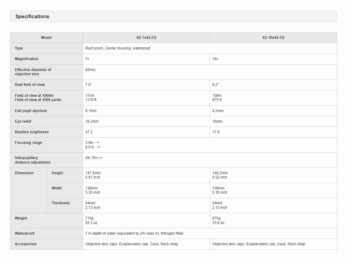 В апреле прошлого (2023) года добавили две новые модели SD 7x42 ED и SD 10x42 ED. Да, они отличаются именно приставкой ED от других SD моделей, то есть это единственные бинокли в серии с ED-стеклом в объективе. Это обновление увеличило стоимость бинокля почти в полтора раза, давайте проверять, что получилось, на примере модели 7x42 - практически уже забытого формата биноклей.