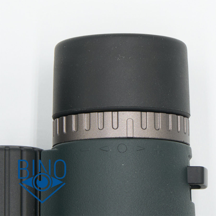 Диоптрийная коррекция выполнена на правом окуляре в виде пластикового кольца с рифлением, на левом окуляре такое же, только гладкое, кольцо под наглазником для симметрии. Вращение кольца диоптрийной коррекции тугое, без ступенек, на 65 градусов влево от нулевой метки и на 60 градусов вправо.