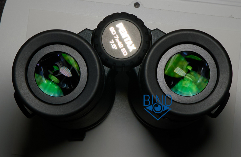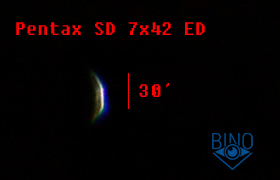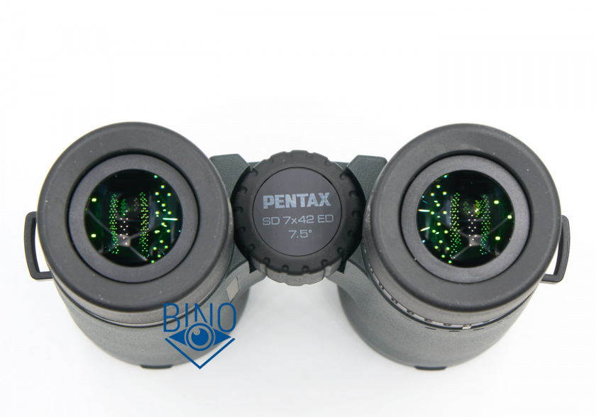 Окулярное поле зрения у Pentax SD 7x42 ED умеренное, около 50 градусов, в картинку не особо заметно погружение. Однако какого-то сильного недостатка в ширине поля нет, это особенность биноклей с большим выходным зрачком 6-7мм, они скрадывают умеренное окулярное поле.