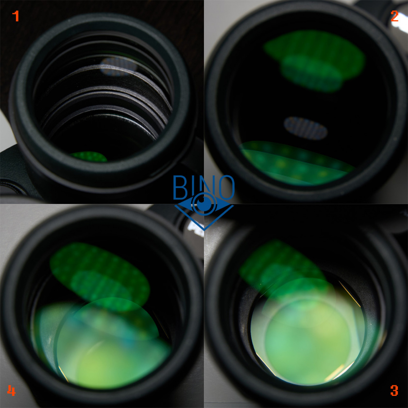 На фото выше (слева): 1 - вид внутренностей тубуса; 2 - блики от объектива; 3 - блики от призмы и вид призменной диафрагмы, она чуть шире, чем призма (видны грани призмы по периметру); 4 - блики от фокусирующей линзы и призмы.