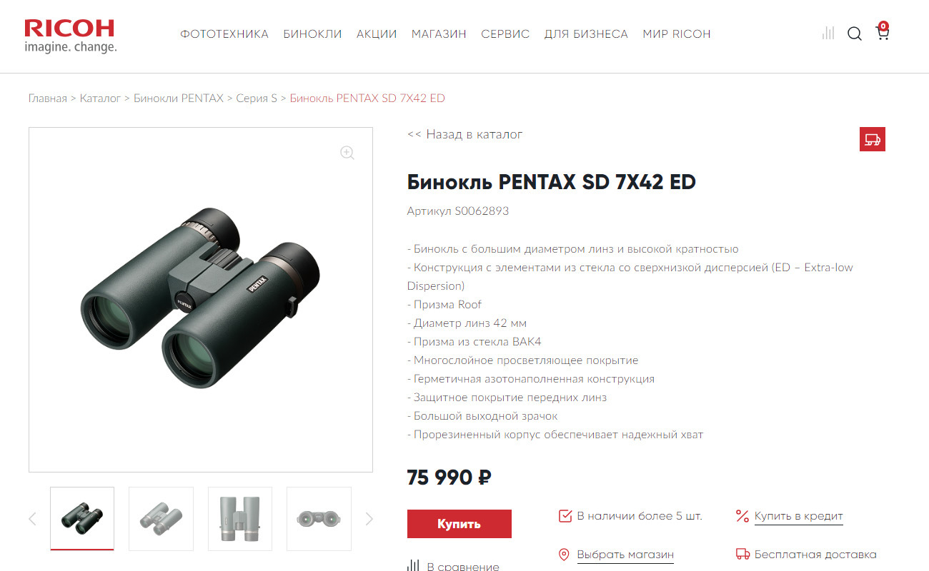 Если вы устали от биноклей большой кратности 8х42, 10х42, то Pentax SD 7x42 ED вполне вариант для покупки: габариты у него в меру компактные, не очень большая кратность это явный плюс. Биноклей 7х42 сейчас практически не представлено на рынке, я даже удивлён, что Pentax решился выпустить такой формат.