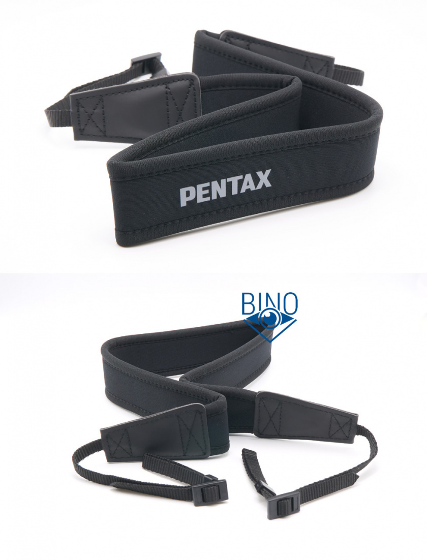 Нашейный ремешок неопреновый, шириной 43мм и толщиной 6мм, покрыт тканью с обеих сторон. Он хорошо тянется и подходит для разгрузки шеи от веса этого бинокля (720гр). Длина ремешка без учёта тесёмок 66,5см, для меня он довольно длинный, бинокль располагается в районе живота, а не выше на груди, как я привык. Проушины для ремешка по бокам тубусов пластиковые и широкие, ремешок легко в них продевается.