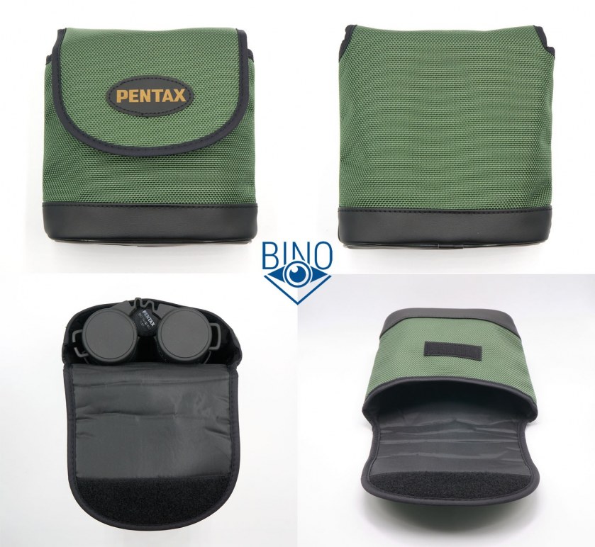 Комплектная сумка синтетическая, стенки со средним или даже небольшим уплотнением для защиты от ударов, крышка закрывается на липучку. Сумка типична для биноклей Pentax последних лет, дно обито кожзамом. Она, похоже, универсальная для разных моделей, туда поместится и формат 10х50. Этот бинокль 7х42 помещается с приличным запасом по ширине. Габариты сумки ДхШхВ 170х158х75мм.