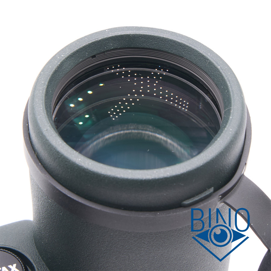 Просвет у стопорных колец объектива около 41,5мм, действующая апертура по тесту фонариком получилась тоже около 41,5мм. Наружная линза объектива выпуклая, утоплена от края тубуса внутрь на 6,6мм по центру и на 7,7мм по краю. Обрезинка загибается вокруг торца тубусов на 4мм, формируя хороший бампер - постановка бинокля на стол мягкая. Снаружи объектива на стопорном кольце есть нарезка светозащиты, она также встречается на подвижном цилиндре перед фокусирующей линзой. Внутренности тубусов выполнены аккуратно, призменная диафрагма окрашена, но матирование не выглядит хорошим - есть поблёскивание на разных элементах конструкции. Края линз объектива зачернены и расположены шире оптического тракта.