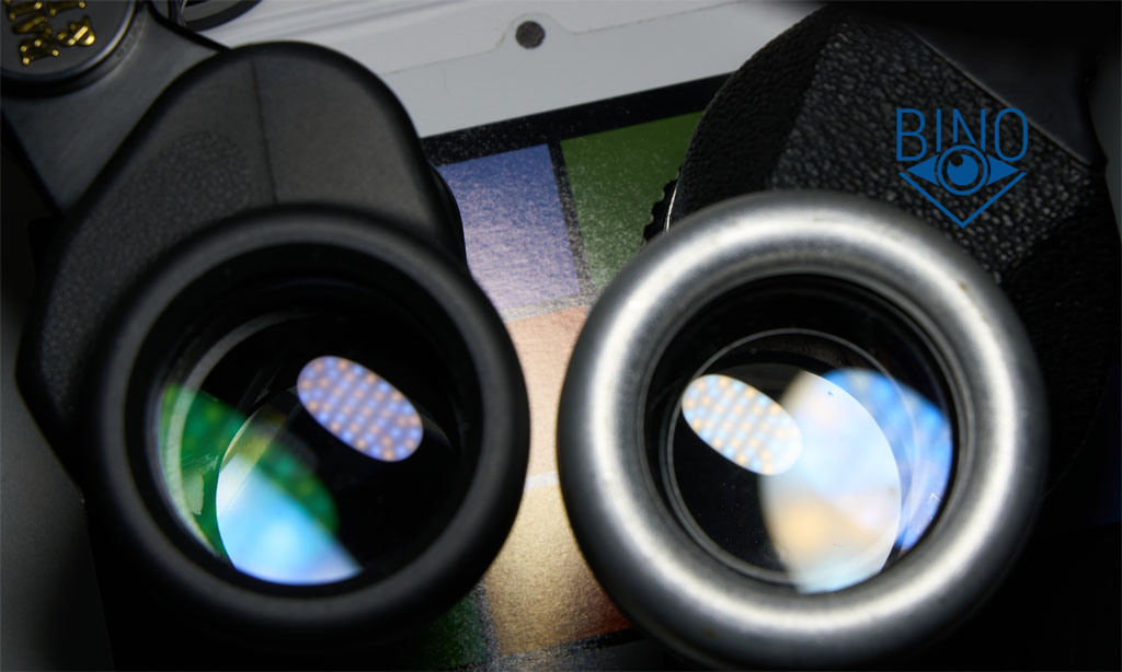 Выходной зрачок крупный, диаметром около 5,6мм. Круглый, но чуть отличается по замеру в разных каналах. Хорошо видно синий ромбик из-за недостаточного размера призм и использованного стекла BK7. Затенение вокруг ВЗ среднее, есть бликование на внутренностях тубусов и переотражения. Кратность бинокля по отношению апертуры к диаметру ВЗ получилась 34/5,6 = 6х. Однако на сравнении с Bausch Legacy 7x35 я не видел заметного отличия в кратности.