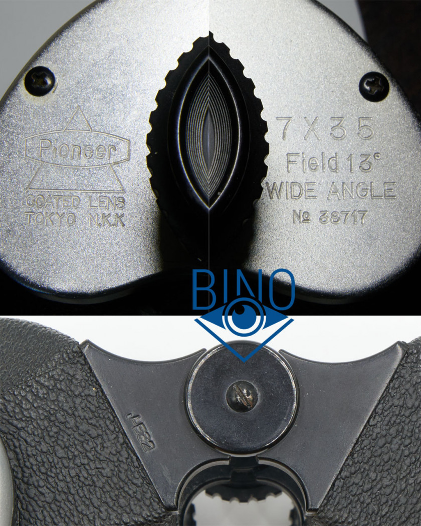 Итак, на корпусе бинокля снизу есть клеймо J-E32, это японская мануфактура Miyako Seiki Co. Ltd., на которой также выпускались детали для известного Tasco #118. В них скорее всего использовались схожие детали, только Pioneer был несколько упрощен и стоил дешевле.