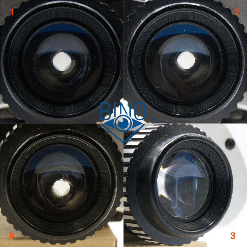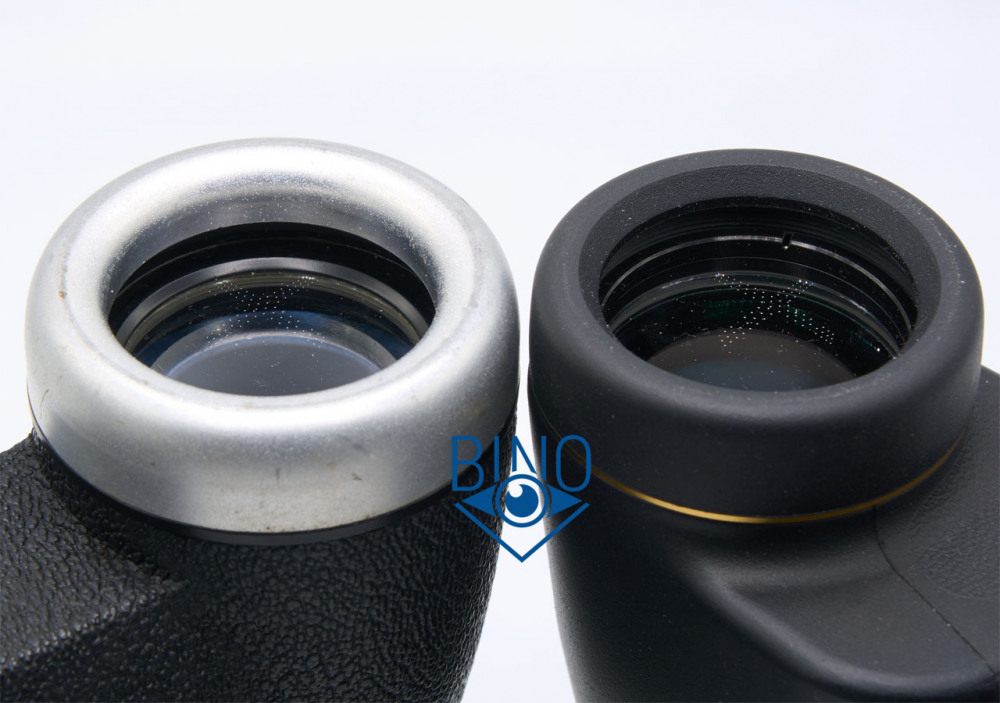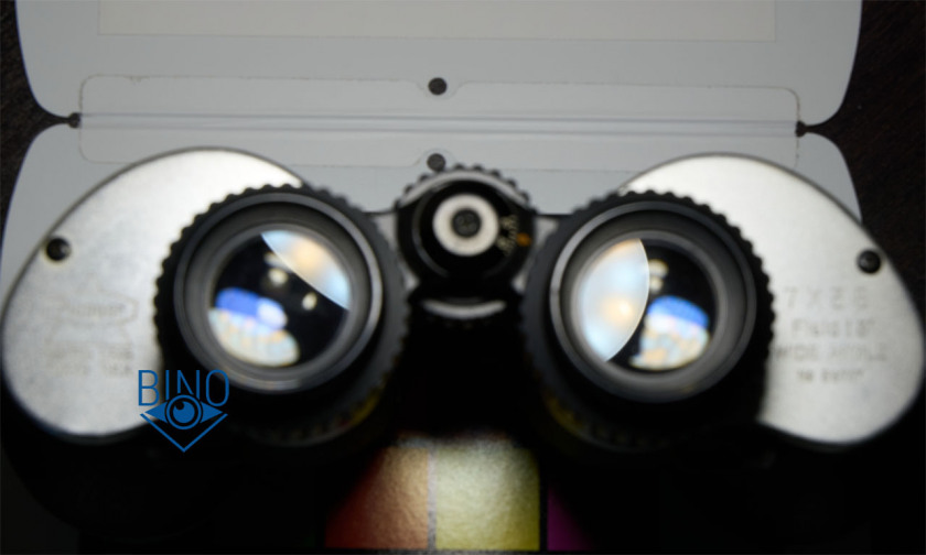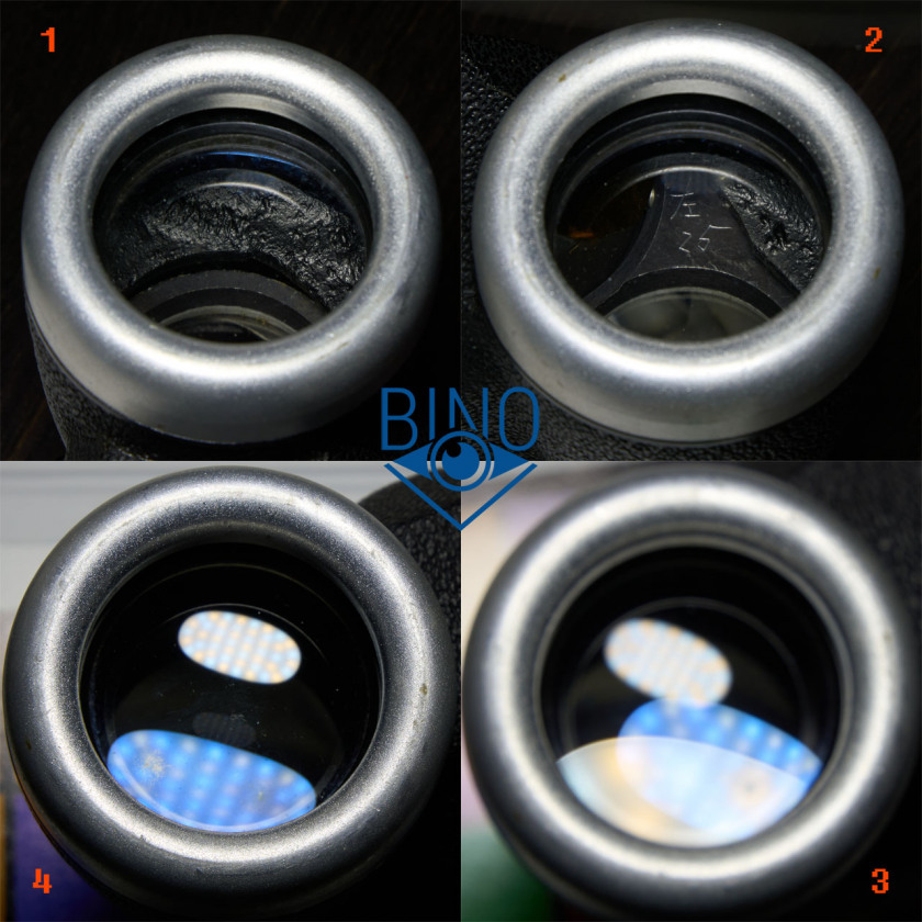 Просвет у стопорных колец объектива около 34,5мм, действующая апертура по тесту фонариком получилась около 34мм. Наружная линза объектива чуть выпуклая, утоплена от края тубуса внутрь на 12,4мм по центру и на 14,2мм по краю. Постановка бинокля на стол гулкая, снаружи объективы предохраняют металлические съемные кольца серебряного цвета. Внутренности тубусов выполнены монументально, крепления только винтами, никакого клея. Торцы наружной линзы объектива не чернены, но расположены шире оптического тракта.